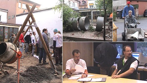 Halbzeit bei der 72-Stunden-Aktion Heute Vormittag im Kindergarten "Regenbogen": Das Gerüst der neuen Hängematten-Schaukel steht. Gestern wurden auch die Betonringe für die Kriechröhre angeliefert. Die Aktionszentrale im Evangelischen Gemeindehaus ist ständig besetzt. (Fotos:C.Richter)(hr) Stand Samstag, 9. Oktober 2004, 17.30 Uhr: