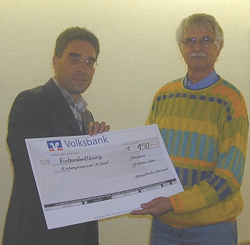Spende soll für die Kirchenrenovierung in St. Josef verwendet werden Pfarrgemeinderatsvorsitzender Paul Bungert (rechts) nimmt den Scheck vom Kolpingsvorsitzenden Wolfgang Hilbert entgegen.(Foto:Eichler)(tw) (wh) Im Rahmen einer Pfarrgemeinderatssitzung am vergangenen Donnerstag, konnte der Vorsitzende der Pfarrgemeinde St. Josef, Paul Bungert, einen Scheck über 150 Euro von der Kolpingsfamilie Eberbach für die Renovierung der Kirche St. Josef entgegennehmen. Wie der 1.Vorsitzende der Kolpingsfamilie Eberbach betonte sei dies der Erlös aus dem Gemeindefrühstück in St. Josef. In seiner kurzen Ansprache dankte Wolfgang Hilbert der Pfarrgemeinde St. Josef für Ihre vielfältigen sozialen Aufgaben und sprach Dank und Anerkennung aus. Die Kolpingsfamilie Eberbach wolle mit ihrer Spende ein Zeichen für die Erhaltung christlicher Werte setzten und daran erinnern, dass nicht an der falschen Stelle gespart werden dürfe so der Vorsitzende der Kolpingsfamilie weiter.