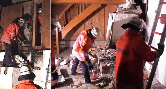 Kaminfeuer machte sich selbstständig (Fotos:Richter)(hr) Zu einem Brand in der Hütte am Jugendzeltplatz Ittertal wurde heute Abend gegen 22 Uhr die Freiwillige Feuerwehr Eberbach gerufen. Bei einer Vereinsfeier war der offene Kamin in dem Gebäude in Betrieb, als plötzlich oberhalb des Kaminabzugs Rauchentwicklung aus der Holzwand festgestellt wurde. Die Feuerwehrleute löschten den Schwelbrand, der die Wand und den Kamin erheblich beschädigte.