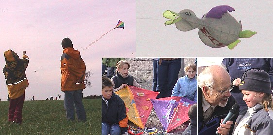 Drachenfest bei kräftigem Herbstwind Auch skurrile Drachenformen wie die windige Ente gab es in Mülben zu bestaunen. Unten rechts der Vorsitzende des Bürger- und Heimatvereins, Günter Lipski, mit der Hauptgewinnerin Kim Zerrahn. (Fotos:Richter)(hr) Die herbstliche Brise wehte steif von Osten, als heute Nachmittag bei sonnigem Wetter wieder Hunderte bunter Drachen auf dem Segelfluggelände in Mülben beim Odenwälder Drachenfest am Himmel tanzten.