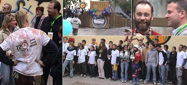 Video ansehen(hr) "72 Stunden - ohne Kompromiss": Die große Sozialaktion des Bundes der Deutschen Katholischen Jugend (BDKJ) ist zu Ende. Rund 800 Jugendgruppen hatten sich mit den verschiedensten Projekten seit Donnerstagabend daran beteiligt. In Eberbach war es die Evangelische Jugend, die im Kirchenbezirk Neckargemünd die Aufgabe hatte, an drei Tagen den Hof des Kindergartens Regenbogen in der Bussemerstraße neu zu gestalten. Pünktlich um 17.07 Uhr fiel bei der Gesamtaktion heute der Hammer, die Eberbacher Gruppe war schon früher fertig.