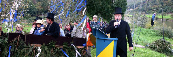 Kerweschlumpel brannte lichterloh Kerwepfarrer Karl Scheidl begleitete die Rockenauer Kerweschlumpel auf ihrem letzten Weg. Am Schiffermast ging sie in Flammen auf. (Fotos: Böhm)(ub) Rockenau feierte in diesem Jahr die Kerwe eine Woche früher als geplant bereits am ersten Oktober-Wochenende. Um der Konkurrenz des "Apfeltages" zu entgehen, stimmten sich die Rockenauer am vergangenen Samstag im Gasthaus zum "Schiff" beim Tanz auf das bevorstehende Ereignis ein. Am Sonntag formierten sich auf Initiative des Rockenauer Kerwe- Clubs 1969 e.V. Fußgruppen, Kerwepfarrer Karl Scheidl, Kerweschlumpel "Betinna", Kerweborscht Christopher Menges, Fahnenträger, der Rockenauer Ziegenbock und verschiedene Themenwagen zum Umzug durch den Ort. Musikalisch begleitet wurde der Zug von der Blaskapelle "Kleiner Odenwald" und der Rockenauer Kerwemusik. Nach dem Umzug wurde in der Festhalle kräftig weitergefeiert. Nach dem Kerwetanz und dem gelungenen Kerweumzug war es wieder soweit. Die Kerweschlumpel musste von ihrer Kerwegemeinde Abschied nehmen. Viele Besucher begleiteten sie gemeinsam mit dem Rockenauer Kerwe-Club und dem Kerwepfarrer auf ihrem letzten Weg. Bevor die Kerweschlumpel am Schiffermast ihr Leben aushauchte, las Kerwepfarrer Scheidl seiner Gemeinde noch einmal ordentlich die Leviten.