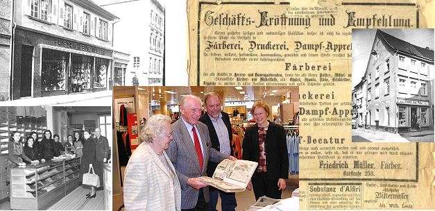 In 125 Jahren vom Färber Müller zum modernen Eberbacher Modehaus Historische Dokumente aus dem Archiv der Familie Müller sowie die Inhaberfamilie beim Studium alter Zeitungsausschnitte. (Foto:Claussen)(jc) Nach dem Schuh- und Sporthaus "Fritz Karl" feiert innerhalb weniger Wochen jetzt ein zweites alteingesessenes Eberbacher Einzelhandelsunternehmen ein stolzes Jubiläum. Mit 125 Jahren blickt das Modehaus Müller in diesen Tagen auf eine beeindruckende Firmengeschichte zurück.