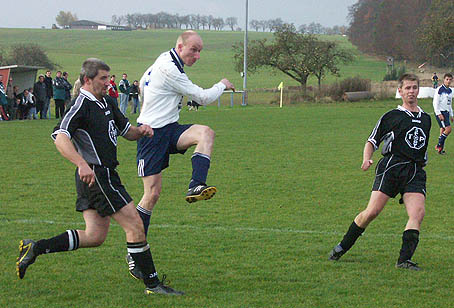 Klarste Torchancen wurden nicht genutzt Alwin Lenz konnte sich hier gut in Szene setzen, doch beim Heimspiel gelang dem SC Weisbach nicht der erhoffte Siegtreffer. (Foto:Baumgartner)(tb) (be) Im dritten Spiel in Folge schaffte es Weisbach nicht, nach einer Führung und einer Vielzahl klarster Torchancen einen Sieg einzufahren und musste das bereits sechste Unentschieden hinnehmen. Weisbach begann aggresiv und drängte Rittersbach die ersten 30 Minuten komplett in die eigene Hälfte. Bereits in der 2. Spielminute erzielte Günter Lenz das 1:0. Größte Torchancen wurden vergeben oder parierte der glänzende Rittersbacher Torhüter und es gelang nicht der 2.Treffer. So kam es wie es kommen musste, der erste Angriff der Gäste brachte stark Abseitsverdächtig das 1:1 durch Spielertrainer Denz. Danach wehrte sich Rittersbach deutlicher und das Spiel verlief ausgeglichen. In der 60.Minute dann die Riesenchance zur Führung für Weisbach doch der Ball wurde von 5 Metern an den Pfosten geschossen. Der Schiedsrichter verlor immer mehr den Faden und übersah klarste Fouls hauptsächlich gegen die Heimmannschaft. Mindestens ein klarer Elfmeter wurde für Weisbach nicht gegeben. Nach einem mittelmäßigen Foul zeigte er einem Rittersbacher Spieler noch die Rote Karte. Rittersbach blieb am Ende durch Konter gefährlich und erkämpfte den Punkt nicht unverdient.