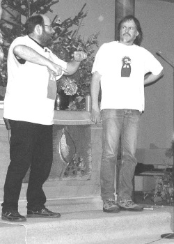 Aber nicht nur im Dialog, sondern auch alleine bewährten sich die beiden Kabarettisten. So hinterfragte Greifenstein kritisch die Gattung Frauenzeitschriften und empfahl den Frauen, sich so anzunehmen, wie sie sind. Herrmann stellte überzeugend einen von der Mutter immer noch abhängigen, gegängelten 42-Jährigen dar, der auf Mamas Rat hin im Juli zwar mit zwei Pullovern zum Campen fuhr, dabei gleichwohl die Unterwäsche vergaß. Immer wieder kamen die beiden Pfarrer auf das ihnen naheliegende Thema Kirche zurück. So erörterten sie unter anderem ein "Kirchenreformstrukturerfolgsbegrenzungsgesetz" und nahmen auch sonst fast jedes kirchliche Klischee unter die Lupe. Gelächter war ihnen dabei sicher.