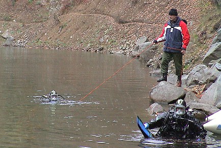 Tauchtraining im eisigen Katzenbuckelsee (Foto:C.Richter)(cr) Während sich die Gegend um den Katzenbuckelsee vorgestern Vormittag allmählich in eine Winterlandschaft verwandelte, stürzten sich Beamte der Wasserschutzpolizei ins kühle Nass. Verpackt in eine rund 45 kg schwere Ausrüstung und in Trockentauchanzügen ging es in den acht Grad kalten See. In der Tauchtiefe bis zu etwa 18 Metern wurde es dann sogar noch einige Grad kälter.