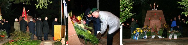 Links oberhalb des Ehrenmals sind die fünf weißen Kreuze, wie sie auch im Emblem des Volksbundes stehen, hell angestrahlt. Fackeln an den Wegen und Kerzen auf den Grabkreuzen des Ehrenfriedhofs vermitteln eine feierliche Stimmung. Aus der Stille des Friedhofs ist der Fanfarenzug zu hören, der die Fahnenträger zum Ehrenfriedhof begleitet. Joachim Bösenecker, örtlicher Vorsitzender des Volksbundes, eröffnet die Feierstunde, in die die Katholische Pfarrkapelle mit einem Choral einstimmt. Dem Gedicht "Wenn die Wälder Farben tragen" eines kriegsblinden Autors folgt "Sanctus dominus deus", gesungen vom MGV Liederkranz.