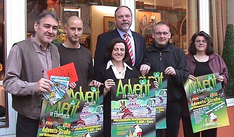 Mit Advents-Straße und Markt der Vereine in die Weihnachtszeit Das Organisationskomitee für das weihnachtliche Eberbach (v.l.): Rolf Wieprecht, Thomas Wagner, Birgit Strohauer-Valerius, Dietrich Müller, Tobias Soldner und Nicole Rupp. (Foto:C.Richter)(cr) Die Tage werden immer kürzer und trotzdem ist reges Treiben in der Eberbacher Innenstadt zu spüren. Schaufenster werden dekoriert, Lichterketten werden an Häusern und in den Straßen aufgehängt und somit wird allen bewußt: Es ist schon wieder Vorweihnachtszeit.