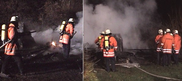 Gartenhaus am Breitenstein niedergebrannt (Fotos:Richter)(hr) Nur Schutt und Asche blieben von einem Gartenpavillon am Breitenstein übrig, der aus noch ungeklärter Ursache heute Abend in Brand geriet. Anwohner bemerkten das Feuer auf dem Grundstück des Hotels "Neckarblick" und alarmierten die Freiwillige Feuerwehr. Diese rückte mit starken Kräften aus und löschte den Brand in kurzer Zeit. Dennoch wurde das Gartenhäuschen vollständig zerstört. Auch die darin gelagerten Gartenmöbel, Kühlschränke und weitere Gerätschaften wurden ein Raub der Flammen.