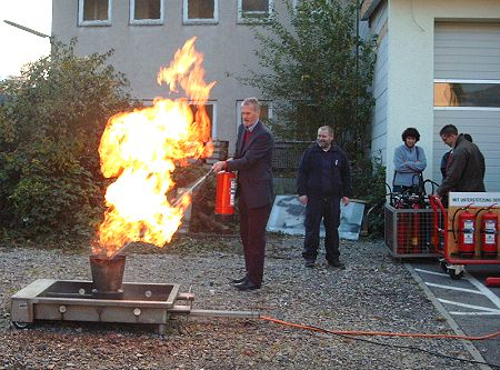 Beim letzten Thema besuchte das Kollegium die Freiwillige Feuerwehr Eberbach. Deren Kommandant, Herr Kubein, stellte zunächst zusammen mit Herrn Bräutigam in einer informativen Powerpoint-Präsentation die allgemeinen Aufgaben der Feuerwehr dar. Anschließend gab es Gelegenheit, die technischen Einrichtungen und Löschfahrzeuge zu besichtigen, und natürlich durften auch einfache, aber sehr eindrucksvolle Löschübungen nicht fehlen.