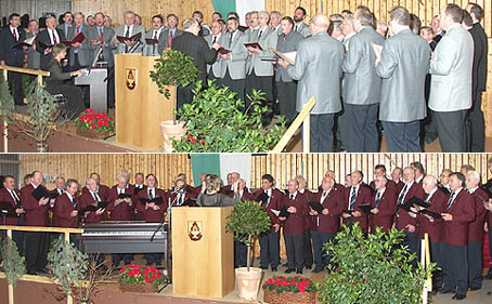 Der große musikalische Abschluss, auch in Anzahl der Sänger auf der Bühne, war dann der Chorgemeinschaft der Männergesangvereine aus Dielbach, Neckargerach und Zwingenberg vorbehalten. Unter der musikalischen Leitung von Bezirkschorleiter Manfred Waibel, zeigten die Sänger ihre Vielseitigkeit und erfreuten die Zuhörer mit "Spiel Zigan", "Herr, wenn Du kommst" und dem populärem Stück "Conquest of Paradise", welches wohl noch jedem in den Ohren liegt, der die fast legendären Boxkämpfe von Henry Maske mit verfolgt hat. Unterstützt wurden die Sänger dabei von Bezirkschorleiterin Karin Conrath am Klavier.