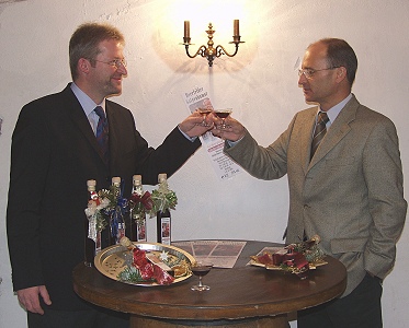 Nun präsentierten zum "Geburtstag" der Brauerei Bürgermeister Gottfried Görig und Diplom-Braumeister Andreas Schmucker das jüngste Kind im Getränkesortiment, den "Beerfelder Galgenhumor", einen Likör aus 33 ausgesuchten Kräutern, hergestellt in einer Odenwälder Edelbrennerei, nach einer brauereieigenen und streng gehüteten Rezeptur.