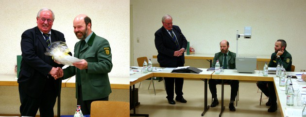 Forstdirektor Dietmar Hellmann vom Gemeinderat verabschiedet Bürgermeister Roland Schilling dankte dem scheidenden Forstdirektor Dietmar Hellmann für die langjährige kooperative Zusammenarbeit. Letztmalig stellte Hellmann, gemeinsam mit Revierleiter Klaus Berberich, dem Gemeinderat den Forstbetriebsplan vor. (Fotos:Böhm)(ub) Als letzte Amtshandlung vor seinem beruflichen Wechsel zum Kreis stellte Forstdirektor Dietmar Hellmann letztmalig den Forstbetriebsplan 2005 im Schönbrunner Gemeinderat vor. Bürgermeister Roland Schilling bedankte sich mit einem Wappenteller für die jahrelange kooperative Zusammenarbeit. Hellmann, dem es in Schönbrunn immer sehr gut gefallen habe, bedankte sich ebenfalls für das gute gegenseitige Verständnis und die von Achtung getragene Zusammenarbeit mit dem ausgewiesenen Fachmann Schilling. Mit dem Wappenteller werde er immer schöne Erinnerungen an Schönbrunn verbinden. Schilling sprach seinen Dank auch den Waldarbeitern aus, die trotz der vielen Sturmschäden immer versuchen, das Beste aus dem Wald zu machen. Auf über eine Million Euro sei allein der Vermögensverlust aus dem Sturmschaden Wiebke zu beziffern.