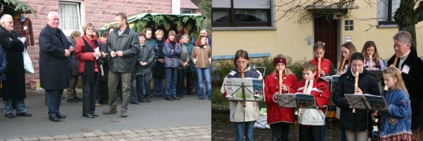 Ortsvorsteher Wilfried Zimmermann begrüßte Bürgermeister Roland Schilling, Gemeinderäte und zahlreiche Gäste, die auch in diesem Jahr wieder den Weg nach Moosbrunn fanden. Traditionell stimmte Marion Ader mit der Flötengruppe der Musikschule am 1. Advent auf die Vorweihnachtszeit ein. Bürgermeister Schilling dankte ihr und den Kindern, die viele Weihnachtslieder spielten und zum Mitsingen einluden. Bei frühlingshaftem Wetter zeigen die Moosbrunner mit ihren vielen Ideen ein gutes Programm mit Nikolaus, Kaffee und Kuchen, handwerkliches und ein gutes kulinarisches Angebot, so Schilling. Auch dieses Jahr fand wieder ein Gospelkonzert mit dem Schönbrunner Frauenchor in der Moosbrunner Kirche statt. Für viele, so Schilling, sei Weihnachten ein Fest der Familie, bei dem die Kinder im Mittelpunkt stehen. In letzter Zeit, so eine Umfrage, gewinne das traditionelle Christenfest wieder mehr an Bedeutung, erklärte Schilling. Die alljährliche Spende überreichte Schilling in diesem Jahr Pfarrerin Angelika Bless , die als Grundstock für die dringend notwendige Kirchenrenovierung gedacht ist. Bless bedankte sich, auch im Namen des Kirchengemeinderates, für die Zuwendung.