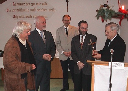 Bronzekreuz ziert Krankenhauskapelle V.l. Otto Wesendonck, Dr. Jürgen Schütz, Martin Hildenbrand, Ekkehard Leytz und Hubert Seitz. (Foto:C.Richter)(cr) Im Namen der Krankenhausleitung begrüßte gestern Morgen Verwaltungsdirektor Martin Hildenbrand Landrat Dr. Jürgen Schütz mit Ehefrau, Mitarbeiter der Krankenhausleitung sowie weitere Gäste, die zu einer Feierstunde in die Kapelle des Kreiskrankenhauses gekommen waren. Grund für das Zusammentreffen war die Übergabe eines vom Krankenhaus erworbenen Kruzifixes an die Krankenhausseelsorger durch Landrat Schütz.