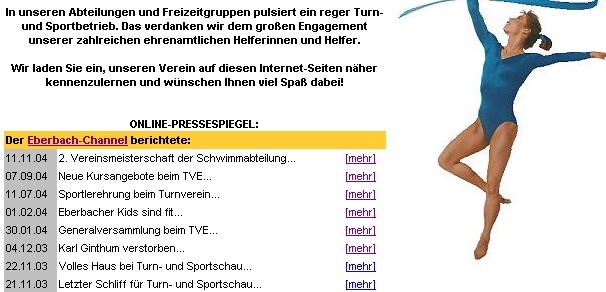 Mit Newsnapping und Newsgrabbing immer eine aktuelle Homepage Der TV Eberbach hat auf seiner Homepage (www.tv-eberbach.de) bereits einen "Newsgrabber" als "Online-Pressespiegel" installiert.(hr) Mit dem EBERBACH-CHANNEL kann sich jetzt jeder die tagesaktuellen Nachrichten aus Eberbach und Umgebung auf die eigene Homepage holen. "Newsnapping" nennen die Macher des Online-Magazins das Verfahren, bei dem jeder Homepage-Betreiber sich die Schlagzeilen des Tages an beliebiger Stelle seiner Internet-Seiten einbauen kann. Ein Klick auf die jeweilige Schlagzeile führt dann per Link zu der vollständigen Meldung im EBERBACH-CHANNEL. Ohne eigenen Pflegeaufwand ist somit die Homepage immer aktuell.