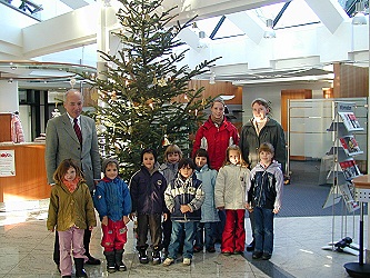 (bro) (ng) Viel Freude beim Christbaumschmücken hatten die Kinder vom evangelischen Kindergarten Regenbogen, Eberbach in der Kundenhalle der Sparkasse Neckartal-Odenwald in Eberbach. Mit selbstgebasteltem Christbaumschmuck verzierten sie den stattlichen Weihnachtsbaum. Als vorweihnachtliches Geschenk überreichte Direktor Wolfgang Kleeberger dem Kindergarten einen Scheck in Höhe von 150 Euro.