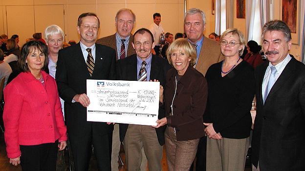13.000 Euro für Schulen im Geschäftsgebiet der Volksbank gespendet Ekkehard Saueressig (3.v.li.) mit Schulvertretern bei der Scheckübergabe. (Foto:Claussen)(jc) Im Rahmen des Adventstreffens der Schulleiter im Geschäftsbereich der Volksbank Neckartal wurde gestern in Neckarsteinach, im Beisein von Volksbank Vorstand Ekkehard Saueressig, wieder ein ansehnlicher symbolischer Scheck an die Vertreter der Schulen überreicht. Saueressig hob eingangs der Veranstaltung nochmals das Engagement der Bank in der Region hervor. Man wolle sich in dieser Beziehung auch weiterhin von den überregional tätigen Großbanken unterscheiden. Für die Volksbank zählten nicht nur die Kennzahlen sondern Beziehung und Dialog mit Kunden und Mitgliedern.