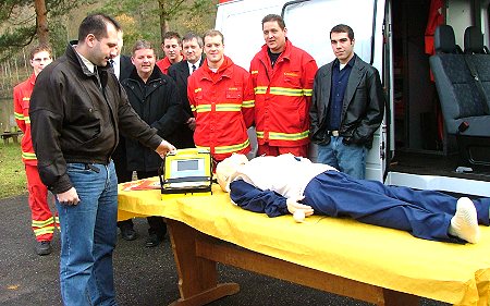 Um in jeder Situation wirkungsvoll agieren zu können, fehlte den First Responders bis jetzt nur noch ein Defibrillator, ein handliches Gerät in Kofferform zur Ersthilfe bei Herzproblemen. Es kostet 4000 Euro. Jetzt endlich konnte es angeschafft werden. Dank großzügiger Spenden von 12 Hirschhorner Firmen und zwei Vereinen. Der DLRG-Ortsverein ist darüber überglücklich. Bei einer kleinen Feierstunde, zu der auch die Sponsoren eingeladen waren, gab Vorsitzender Thomas Uhrig in Anwesenheit von Rolf Matthes vom Gewerbeverein seiner Freude darüber Ausdruck und sagte Dank. Jetzt endlich könne man das therapiefreie Intervall zwischen Eintritt des Notfalls und dem Eintreffen des Notarztes wirkungsvoll überbrücken. Denn, so Uhrig, bei Kammerflimmern beispielsweise verringere jede Minute ohne entsprechende Hilfe die Überlebenschance des Patienten um 10 Prozent. Durch Defibrillation können ausgebildete Ersthelfer also Leben retten. Er betonte ausdrücklich, das die First Responder der DLRG sich keinesfalls als Ersatz und schon gar nicht als Konkurrenz zu anderen Rettungsdiensten sehen, sondern diese lediglich im Notfall unterstützen wollen.