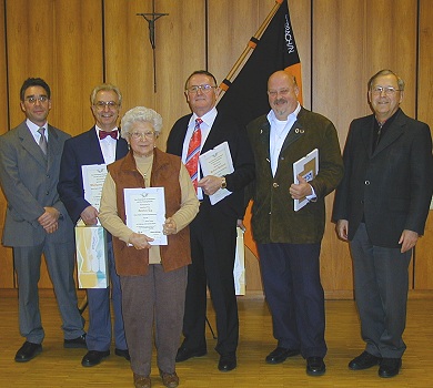 Feierstunde mit Ehrungen zum Kolpinggedenktag (v.l.)Wolfgang Hilbert, Wolfgang Böhle, Gretel Egg, Robert Rechner, Hermann Hold, Pfarrer