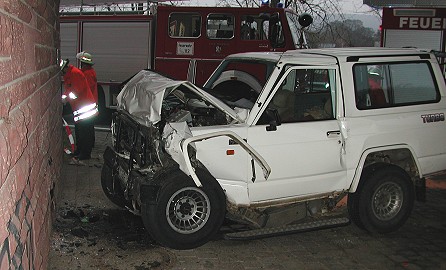 Zwei Tote bei Unfall am Mosbacher Kreuz (Foto:Polizei)(hr) (pol) Zwei Tote und ein total beschädigter PKW waren die Bilanz eines schweren Verkehrsunfalls heute gegen 8.35 Uhr auf der L 588 im Bereich des Mosbacher Kreuzes. Auf der Fahrt von Hochhausen in Richtung Mosbach war ein Nissan Patrol, besetzt mit einem älteren Ehepaar, aus bisher ungeklärter Ursache im Bereich der Brückenauffahrt nach links von der Fahrbahn abgekommen und gegen die Sandsteinmauer geprallt. Beide Insassen erlitten dabei tödliche Verletzungen.