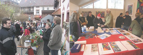 Viele hundert Besucher beim Weihnachtsmarkt auf dem Schwarzacher Hof (Fotos:Peters)(tw) (ap) Viele hundert Gäste nutzten am vergangenen Sonntag das schöne Wetter, um den traditionellen Weihnachtsmarkt auf dem Schwarzacher Hof zu besuchen. Dort erwarteten sie zahlreiche liebevoll geschmückte Stände mit einem üppigen Angebot origineller Geschenkideen aus den verschiedensten Bereichen der Johannes-Anstalten. Auch die Palette kulinarischer Genüsse ließ keinen Wunsch offen. Die Posaunenchöre aus Schwarzach-Aglasterhausen und Neidenstein sowie die Jugendkapelle Schwarzach verbreiteten weihnachtliche Stimmung. Wem die Beine müde wurden, konnte sich bequem im Planwagen über das Gelände kutschieren lassen. Viele verbanden das Angenehme mit dem Nützlichen und erstanden beim benachbarten Staatlichen Forstamt einen frisch geschlagenen Weihnachtsbaum.