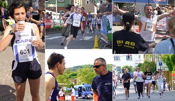 (hr) Luca Bongiovanni vom TV Schriesheim ist mit einer Zeit von 1:14:36 Stunden der Sieger in der "Königsdisziplin" Halbmarathon beim heutigen 4. CH-Alpha-Frühlingslauf, der im Rahmen des Eberbacher Frühlingsfestes stattfand. Unser Bild unten Mitte zeigt ihn (links) im Gespräch mit Moderator Toni Dausch nach dem Lauf. Auf Platz zwei folgt Johannes Scheubert-Engl vom TSV Buchen, Dritter wurde Hermann Düngelhoef (Mannheim). Mit dabei - "in geheimer Mission" mit der symbolträchtigen Startnummer "007" - war auch Eberbachs Bürgermeister Bernhard Martin, der erstmals im Halbmarathon startete. Unser Bild oben rechts zeigt ihn beim Zieleinlauf.