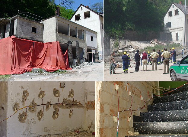 (hr) Mit einer präzisen Sprengung verwandelte die "Fachgruppe Sprengen" des THW-Ortsverbandes Neunkirchen heute ein ehemals gewerblich genutztes Nebengebäude im Eberbacher Gretengrund in einen Schutthaufen (siehe Videoclip).