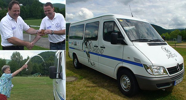 (hr) Ein Kleinbus für die Kinder- und Jugendmannschaften wurde heute beim VfB Eberbach offiziell in Betrieb genommen. Der 1. Vorsitzende Joachim Scheible übergab hierzu die Fahrzeugschlüssel an Jugendleiter Bernd Lemberger (Bild oben links, v.r.).