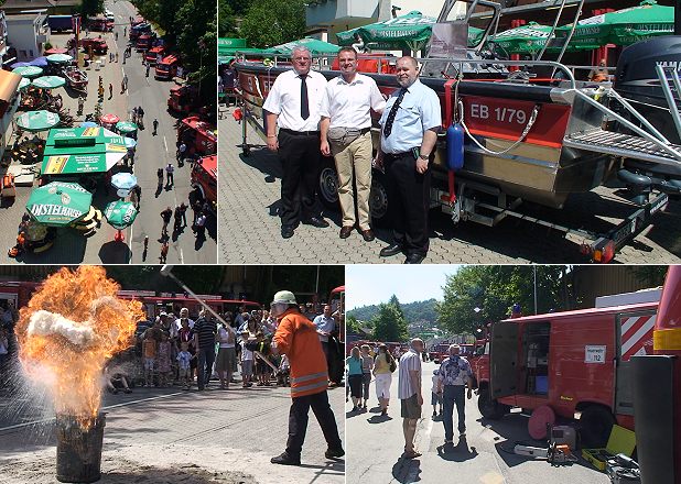 Sämtliche Abteilungen der Eberbacher Wehr beteiligten sich heute, zeigten Fahrzeuge und Geräte und informierten die große Besucherschar über die Feuerwehr. Für Kinder bot die Jugendfeuerwehr einen Spielepark an. Es gab Feuerlöschübungen und eindrucksvolle Demonstrationen. Beispielsweise wurde gezeigt, welche fatalen Folgen es hat, wenn man brennendes Fritierfett mit Wasser zu löschen versucht (Bild unten links).