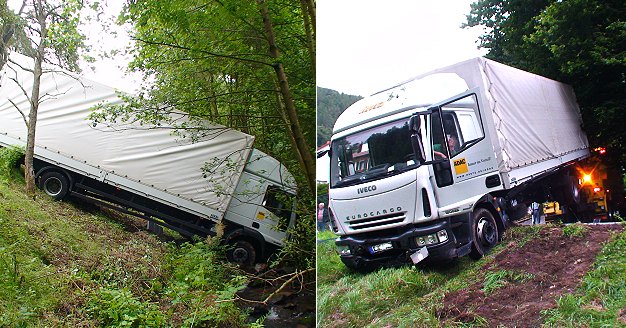 (hr) Kein Halten mehr gab es heute gegen 17.15 Uhr für einen Lkw-Fahrer im Holdergrund. Der 45-jährige Mann aus Mönchengladbach war mit seinem Laster auf einem abschüssigen Seitensträßchen unterwegs, als die Bremsen versagten, wie er später angab. Er konnte gerade noch abspringen, bevor der Truck am Ende des Steilhangs ins Bett des Holderbaches krachte, nachdem er einen Gartenzaun durchbrochen hatte. Der Fahrer verletzte sich und musste vom DRK ins Krankenhaus gebracht werden.