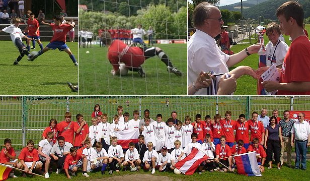 Oben Spielszenen aus dem Finale. In der MItte der entscheidende Neunmeter, den "Österreichs" Torwart hält. Rechts Pokalübergabe durch Sparkassenvorstand Gerhard Stock. Unten die vier besten Teams mit Betreuern und Organisatoren. (Fotos:Richter)