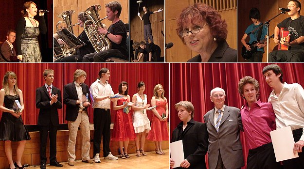 Oben v.l. Julia Betzin und Timo Kraft, Bläserklasse, Akrobatikshow, Schulleiterin Regine Sattler-Streitberg, "61 Inch". Unten die Preisträger Anna-Lena Wilk, Kevin Schwing, Lukas Amend, Silvan Koch, Milena Reis, Elena Schnitzhofer und Julia Waldi (v.l.) Daneben Helmut Ehret mit Christian Becker, Ferris-Elias Jung und Lars Jakusch nach der Übergabe der Ehret-Preise. (Fotos:Richter)