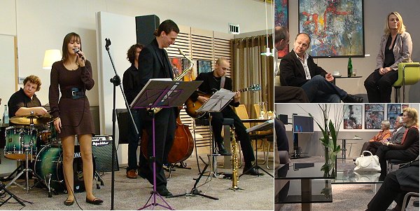 (hr) Der Jazzfrühschoppen bei Ronald Schmitt Tische ist inzwischen schon Tradition bei den alljährlichen Eberbacher Jazztagen. Heute gastierte das junge Ensemble "Jazzico" aus Göppingen im Ausstellungsraum der renommierten Möbelbaufirma im Gretengrund. Die optische Ergänzung zum Musikgenuss lieferte diesmal der Eberbacher Künstler Manfred Garstka, der einen Querschnitt seiner Bilder ausstellte.