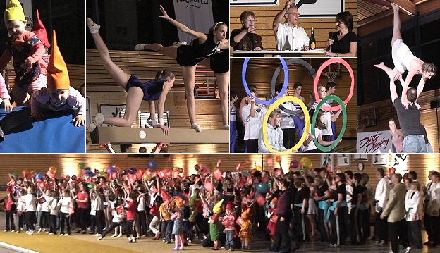 Rund 200 Aktive zeigten einen bunten und schauprächtigen Querschnitt durch das turnsportliche Angebot des größten Eberbacher Sportvereins. Den Anfang machten die "Turnzwerge" vom Kleinkind- und vom Eltern-Kind-Turnen. Nach einem Einblick ins Judo-Training und Volleyball-Spielszenen zeigten die Fördergruppen, dass Gerätturnen "SHREK"-lich schön ist: Sie hatten sich die beliebte Trickfilmfigur als Maskottchen gewählt. Mit dem "Indiaca"-Team präsentierte sich eine recht neue Sportabteilung des TV, und die Nachwuchs-Jazztänzerinnen der "Dancing Flames" ließen in ihrer Show die 80er Jahre wieder aufleben. Nach einer Turndarbeitung der Allgemeingruppen an außergewöhnlichen "Geräten" wie einem großen Fallschirm oder Handtüchern ging es in die Pause.