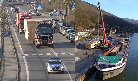 (cr)Zahlreiche Schwertransporte prägten heute zeitweise das Bild auf Eberbachs Straßen. Die mit großen Holzkisten beladenen Laster kamen - oft mit Polizeigeleit - von der Firma DILO im Ittertal und fuhren zum Neckarlauer, wo ihre Fracht von einem schweren Autokran auf ein Binnenschiff gehievt wurde.
