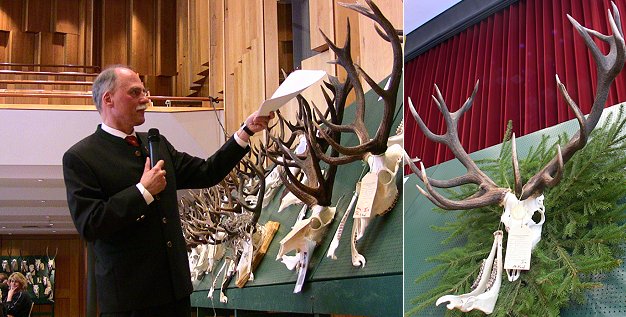 Zur Strecke kam überwiegend so genanntes "Kahlwild", also weibliche und junge Tiere, die kein Geweih tragen. Bei 133 Stücken handelte es sich um Hirsche mit mehr oder weniger stark ausgeprägtem Kopfschmuck. Anhand der Trophäen und dem Alter können die Jäger Rückschlüsse auf Struktur und Zustand des Wildes ziehen. Deshalb ging auch in diesem Jahr der Vorsitzende der Rotwildjägervereinigung, Dr. Andreas Wiese, ausführlich auf die gezeigten Geweihe ein (unser Bild links). Wiese zeigte sich besonders darüber erfreut, dass in diesem Jahr neun ältere Hirsche (über 10 Jahre) vertreten waren, im Vorjahr waren es nur sieben gewesen. Der Spitzenhirsch aus dem Ulfenbachtal erzielte nach einem bestimmten Punkteschema 201,25 Punkte, wofür dem Revierinhaber die goldene Hegemedaille verliehen wurde. Es handelt sich um den fünftstärksten Hirsch, der jemals im Odenwald erlegt wurde (Bild rechts).