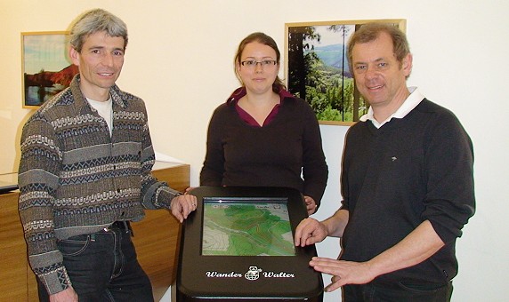 "Wanderwalter"-Erfinder Hardy Wieland (r.) stellte gemeinsam mit Naturpark-Geschäftsführer Manfred Robens und Praktikantin Maria Hartwig die Software in Eberbach vor. (Foto: Claudia Richter)