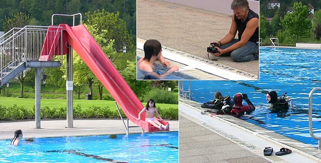 Ob im Taucheranzug oder in der Badehose: Im Freibadwasser ließ es sich gut aushalten. Oben Dreharbeiten mit Peter Krauch. (Fotos: Hubert Richter / Claudia Richter)