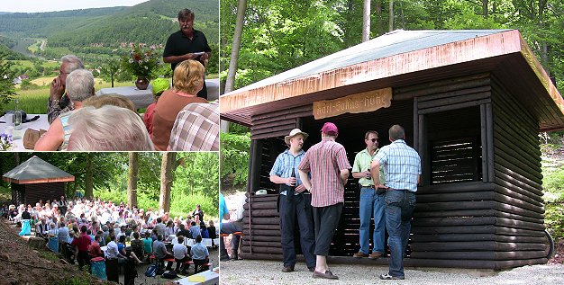 (hr)Ein Gottesdienst unter freiem Himmel mit Dekanin Hiltrud Schneider-Cimbal bildete heute Vormittag den Auftakt zur Einweihung der renovierten Schutzhütte am Pleutersbacher Waldrand, die jetzt den Namen "Karl-Sohns-Hütte" trägt.