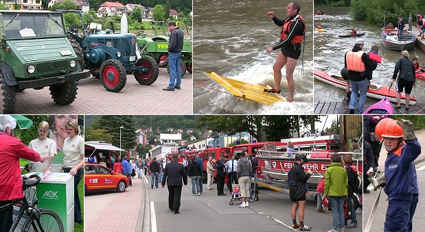 Oben die Schlepperausstellung in Hirschhorn, daneben Josef Beisel auf "Wasserski". Unten die AOK-Stempelstelle für Radler bei der Rudergesellschaft Eberbach und das Feuerwehrfest. (Fotos: Hubert Richter)