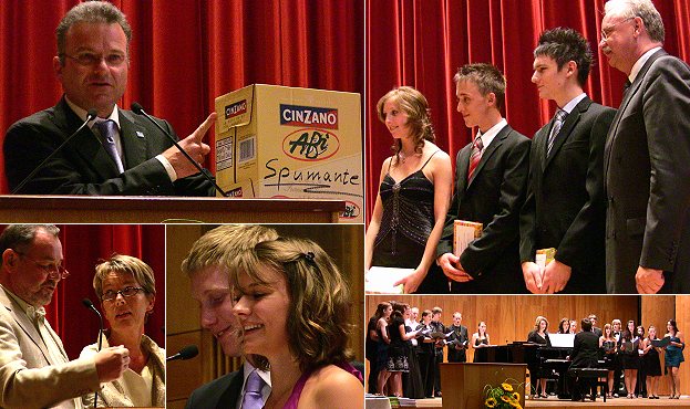 Vor der Zeugnisausgabe stand wie immer eine ganze Reihe von Preisverleihungen. Ausgezeichnet wurden zunächst die "Spitzenreiter" mit dem Notendurchschnitt von 1,0: Magdalena Schindler, Christian Kaiser und Lukas Falk (Bild oben rechts, v.l. mit Helmut Schultz). Den Scheffelpreis für besondere Leistungen in Deutsch erhielt Jana Mertes. Weitere Preise wurden verliehen in den Fächern Geschichte (Marius Hoock), Physik (Patrick Scholl), Chemie (Carola Ebert), Sport (Lisa Weber), Latein (Christian Kaiser, Frauke Stupperich), Englisch (Magdalena Schindler), Französisch (Juliana Koch), Spanisch (Stella Ranieri), Gemeinschaftskunde (Magdalena Schindler), Mathematik (Lukas Falk), Informatik (Benjamin Schäfer), Biologie (Victoria Damerell), Bildende Kunst (Madeleine Scherer), Musik (Benedikt Held), Religion (Magdalena Schindler, Helen Herhuth) und Ethik (Vivian Schneider). Auszeichnungen gab es auch für die Förderung und Anerkennung des Ehrenamtes im Sport (Manuela Vay), für das Seminar Business@School (Lena Götz, Constanze Koppe, Nadine Schulz, Cecilia Petto) sowie für besonderes Engagement an der Schule (Magdalena Schindler, Benedikt Held, Christina Handbauer, Franziska Nava, Christian Kaiser, Lisa Weber, Dominique Boch, Florian Keiser, Sarah Hoffmann, Tobias Schölch, Tobias Tamberg, Julia Deschner, Maximilian Iberl, Christoph Markuszweski, Hannes Zimmermann). Geehrt wurden auch die Streitschlichterinnen Lisa Morr, Tanja Sauer, Julia Deschner und Juliane Koch sowie Priska Cimbal für die grafische Gestaltung des Programms und der Einladung. Benedikt Held hatte vor einigen Tagen bereits in Karlsruhe den Werner-Stober-Preis für Musik erhalten.