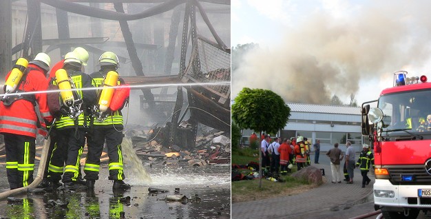 Gegen 17.30 Uhr war das Feuer mit starker Rauchentwicklung und explodierenden Gaskartuschen aus bislang ungeklärter Ursache in einem Außenlager der Werkstätten ausgebrochen. Rund 360 Feuerwehr- und Rettungskräfte aus dem Neckar-Odenwald- und dem Rhein-Neckar-Kreis waren im Einsatz. Mit dabei war auch die Freiwillige Feuerwehr Eberbach mit einem Atemschutzcontainer. Zwei Feuerwehrleute mussten nach Schwächeanfällen notärztlich behandelt werden. Weitere Personen wurden nicht verletzt, was sicherlich auch dem Umstand zu verdanken ist, dass heute Sonntag ist. Gegen 21 Uhr war der Brand weitgehend gelöscht. Schadstoffmessungen der Feuerwehr haben ergeben, dass keine Gesundheitsgefahr für die Bevölkerung durch die Rauchgase bestand.