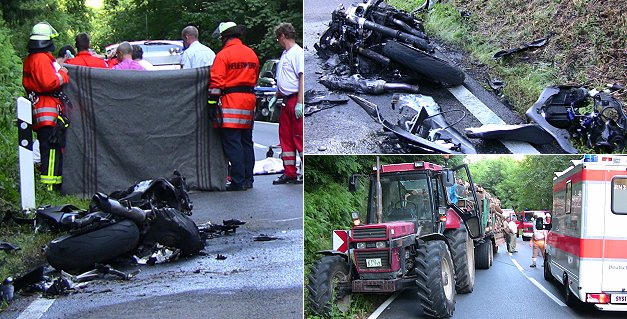 Der Mann war mit seiner Yamaha auf der Fahrt in Richtung Haag aus bislang unbekannten Gründen in einer Rechtskurve nach links von der Fahrbahn abgekommen und gegen die Böschung geprallt. Bei dem Sturz wurde der Biker von einem entgegenkommenden Traktor mit Anhänger erfasst. Der Schlepper überrollte das Motorrad, das sofort Feuer fing und vollständig ausbrannte. Die Abteilung Haag der Freiwilligen Feuerwehr Schönbrunn löschte den Brand.