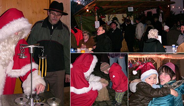 Für weihnachtliches Personal ist auch gesorgt: Am heutigen Samstag kommt um 11 Uhr das Christkind, begleitet von den Fanfarenzug-Bläsern. Für Aufsehen und funkelnde Kinderaugen sorgte gestern Abend der Weihnachtsmann, der aus seinem Sack Obst und Süßigkeiten an die großen und kleinen Marktbesucher verteilte. Er war direkt vom EBERBACH-CHANNEL auf den Weihnachtsmarkt gesandt worden, denn es handelte sich um unseren Reporter Peter Krauch (siehe Videobericht). Einen Besuch des "echten" Weihnachtsmanns hat das Marktteam für Sonntag um 15 Uhr angekündigt.