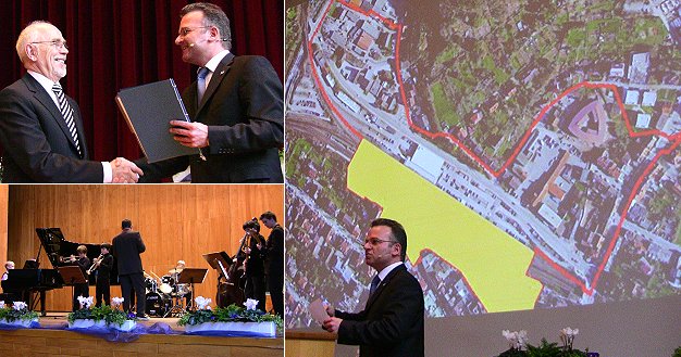 Bürgermeister Bernhard Martin gab einen umfassenden Einblick in abgeschlossene, laufende und geplante Vorhaben, hier das Sanierungsgebiet Güterbahnhofstraße. Günter Lipski (o.l.) erhielt den Ehrenring der Stadt. Unten die Jugend-Jazzcombo "Trumpetbox". (Fotos: Hubert Richter)