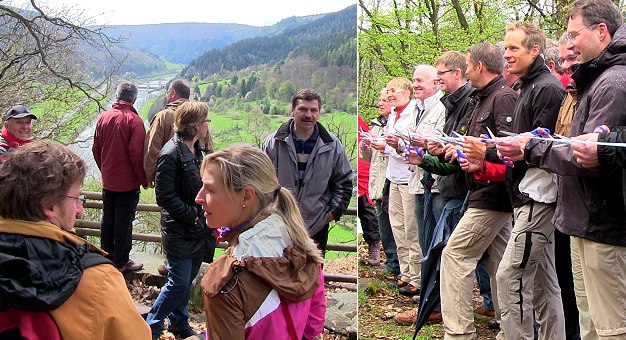 Auf dem Schollerbuckel wurde heute das symbolische Eröffnungsband durchschnitten. Links Eröffnungsgäste am Aussichtspunkt "Teufelskanzel". (Fotos: Hubert Richter)