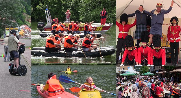 Segwayfahren (l.) und Schnupperpaddeln (Mitte unten) in Hirschhorn. Mitte oben Schlauchbootrennen in Eberbach, rechts des Fest zum 50. Geburtstag der "Viktoria-Torte" in der Friedrichstraße, oben die Hallodries der KG Kuckuck. (Fotos: Hubert Richter)