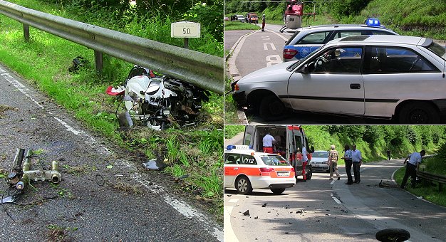 Das Wrack der Honda wurde unter die talseitigen Leitplanken geschleudert, während der Opel am talseitigen Bordsteinrand zum Stehen kam. Der Autofahrer verletzte sich bei dem Crash leicht.