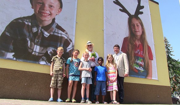 Großformatige Kinderfotos an Stadtmauer und Rathaus